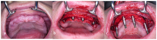 Surgical interventions were performed by M.A. under local anesthesia and in some cases under conscious sedation with I.V. benzodiazepine (0.17 mg/kg). All patients received four implants (HiTec LGI, Herzliya, Israel) according to the All-on-4 treatment concept: two straightly placed mesial (placed in region 12 and 22) and two angulated distal implants (Figure 1a–c, placed in regions 15 and 25). Implant sizes were 13 mm for the straight and 16 mm for the angulated implants, respectively, all with a diameter of 4 mm. Briefly, after raising a mucoperiosteal flap with releasing incisions on the vestibular aspect in the distal to the molar and the midline area, the whole maxillary alveolar crest was exposed. In the presence of a high smile line, bone level was reduced with an ostectomy. After the identification of the anterior bony wall of the maxillary sinus through a bony window of 3 mm, the placement was started with the posterior implants with the aid of a special guide (Edentulous guide, Nobel BiocareTM, Göteborg, Sweden). The insertion of all implants followed standard procedures according to the manufacturer guidelines; however, a peak insertion torque of at least 35 N/cm should be reached to allow an immediate functional loading concept. After placement of the implants, impression copings were placed, and a primary closure was conducted via 3–0 nonresorbable sutures. The functional loading was performed within 24 h after insertion. Postoperative instructions, such as the avoidance of vigorous mouth rinsing, immediate use of ice packs in the first 24 h, upright sitting, a liquid or soft diet for the first 24 h, avoidance of eating crunchy foods, and restriction of physical activities on the day of surgery, were given. Ice packs were placed on the outside of the face where the implants were placed. Ice was used for the first 48 h to decrease swelling by applying it as continuously as possible. Antibiotics (amoxicillin 875 mg/clavulanic acid 125 mg) were given 1 h prior to surgery and two times a day for 5 days thereafter. For the patients with penicillin allergy, clindamycin 600 mg was prescribed with the same posology. The sutures were removed 7 days after surgery.