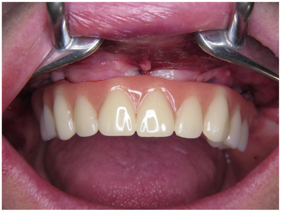 The survival rates for both immediate and final prostheses were 100%. No major complications, such as the fracture of the framework, occurred. Dislodgement of the acrylic teeth of the provisional superstructure was detected in four cases, which was managed in situ. Discoloring of the acrylic teeth was observed in nearly all provisional acrylic superstructures.