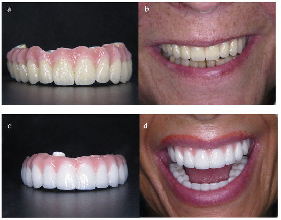 (a,b) Metal–ceramic implant-supported fixed prosthesis; (c,d) monolithic zirconia.