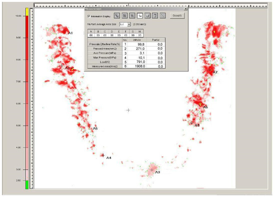 Analysis of the bite force with Dental Pre-scale 50H type R and Occluzer FPD-703 (Fuji Photo Film Co., Tokyo, Japan). The distribution shows a well-balanced occlusal load on the molar area, which corresponds to the natural dentition.