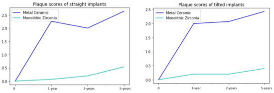 Plaque accumulation was significantly higher around the implants in the metal–ceramic group and the difference between two groups was statistically significant (p < 0.001). There were no significant differences in terms of plaque accumulation between the straight and tilted implants.