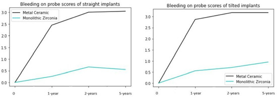 Bleeding on probing measurements around the implants revealed no statistically significant differences regarding the implant angulation. However, significantly higher values in the group with metal–acrylic superstructures were observed throughout the examination period over the monolithic zirconia group.