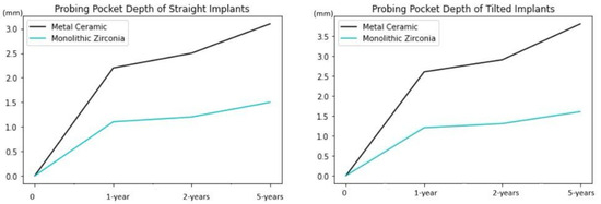PPD increased consistently and significantly over time in the metal–ceramic group. Significantly shallower pockets were found at the implants supporting the monolithic zirconia superstructures (Figure 9) There were no statistical differences between straight and tilted implants for both groups.