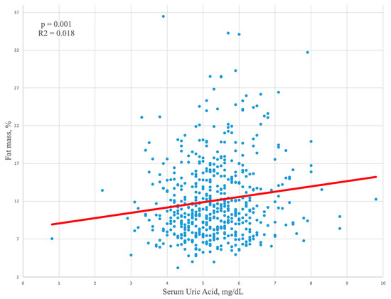 In the relationship between uric acid and fat mass, gender differences were confirmed when we compared athletes with an excess of fat mass. In fact, in male athletes with a fat mass exceeding 22% (Table 3), higher uric acid values were found (5.8 ± 1 mg/dL vs. 5.3 ± 1 mg/dL in those with normal %, fat mass p = 0.010), while in females with fat mass > 32%, similar uric acid levels were found, compared to those with normal fat mass (p = 0.459). In male athletes, a positive linear correlation between fat mass and serum uric acid was found (Figure 1).