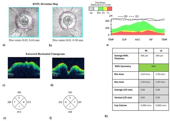 Optic disc cube (200 × 200 protocol) centered on the optic nerve head (ONH). It represents the optical coherence tomography of a patient with idiopathic intracranial hypertension without papilledema (IIHWP), demonstrating the presence of bilateral papilledema, more prominent in the right eye. (a,b) Images of ONH (bordered by a dark line). ONH swelling and consequent increased thickness in the right eye (c) and in the left eye (d) are discernible looking at horizontal B-scans. Thickening of RNFL of all quadrants can be observed in (e–g). An overview of OCT parameters is represented in (h). IIHWP: idiopathic intracranial hypertension with papilledema; OCT: optical coherence tomography; ONH: optic nerve head; RNFL: retinal nerve fiber layer; RE: right eye; LE: left eye.