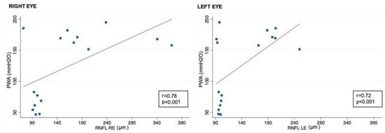 Correlation between CSF PWA and RNFL in right and left eyes; RNFL: retinal nerve fiber layer; CSF PWA: cerebrospinal fluid pressure pulse wave amplitude; r: Spearman correlation coefficient.