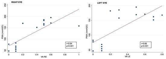 Correlation between CSF PWA and visual acuity data in right and left eyes; VA: visual acuity expressed as logarithm of minimal angle of resolution (LogMAR); CSF PWA: cerebrospinal fluid pressure pulse wave amplitude; r: Spearman correlation coefficient.
