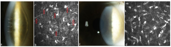 Patient with multiple myeloma of type IgA lambda (#8, Table 2). (a) Diffuse stromal flake-like PPK (white arrow) in the left eye before systemic therapy, (b) needle-like and punctiform deposits (red arrows) in the stroma of the left eye at a depth of 219 µm under IVCM, (c) clear cornea (white arrow = absence of the opacity) of the left eye due to recovery from PPK after systemic therapy and autoSCT, (d) absence of paraprotein deposits in the stroma at a depth of 241 µm after therapy.
