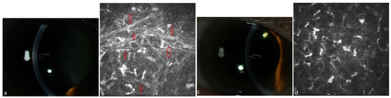 Patient with multiple myeloma of type IgA lambda (#10, Table 2). (a) Stromal flake-like opacity (white arrow) in the right eye before systemic therapy, (b) needle-like deposits (red arrows) in the stroma of the right eye at a depth of 152 µm under IVCM, (c) clear cornea of the right eye (white arrow = absence of the opacity) due to recovery from PPK after systemic therapy, (d) absence of paraprotein deposits in the stroma at a depth of 150 µm after therapy.