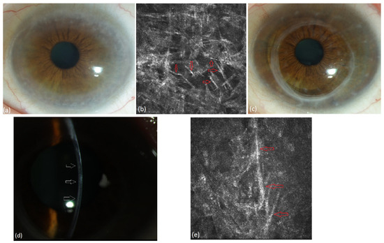 Patient with lymphoplasmacytoid immunocytoma and MGUS of type IgG kappa (#3, Table 3). (a) Diffuse stromal flake-like opacity in the left eye preoperatively, (b) extracellular needle-like deposits (red arrows) in the stroma of the left eye at a depth of 503 µm under IVCM, (c) recurrence-free corneal graft 24 months after surgery, (d) mild stromal recurrence of PPK (wihte arrows) after 27 months, (e) extracellular needle-like deposits (red arrows) in the stroma of the left eye at a depth of 538 µm 27 months after PKP.