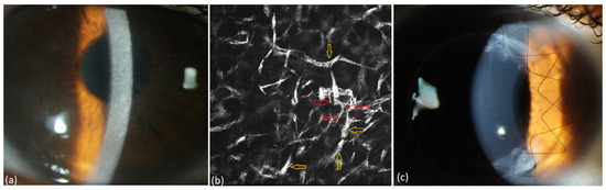 Patient with MGUS of type IgG kappa (#4, Table 3). (a) Diffuse stromal flake-like opacity in the right eye, (b) intracellular (yellow arrow) and extracellular (red arrow) needle-like deposits in the stroma of the right eye at a depth of 494 µm preoperatively, (c) recurrence-free corneal findings one year after surgery.