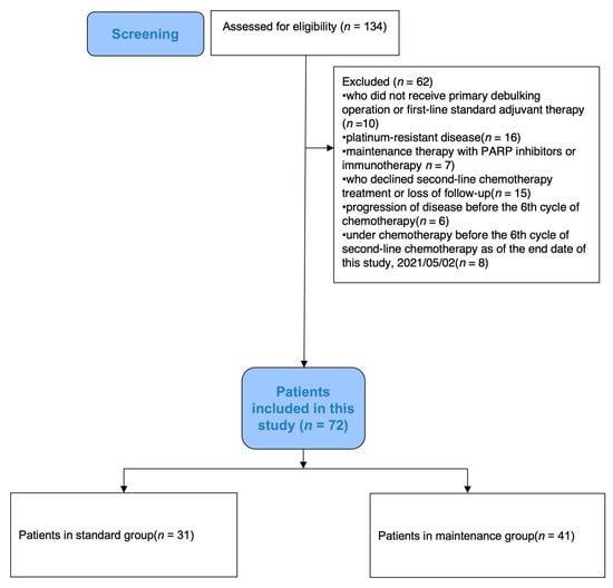 A total of 72 patients who had exhibited either complete or partial response after six cycles of second-line chemotherapy, based on the images from their CT scan and the incorporated criteria of RECIST 1.1 and CA-125 agreed by the Gynecological Cancer Intergroup (GCIG), were included in the study. The patients were then divided into two groups according to the number of cycles they received, which included both a standard group (6 cycles) and a maintenance group (more than 6 cycles). Patients who underwent secondary cytoreduction surgery were evaluated first in multidisciplinary team meetings and needed to fulfill the following criteria: single or countable tumor lesions that were resectable, minimal ascites, and no distant metastases seen on PET or CT scans.