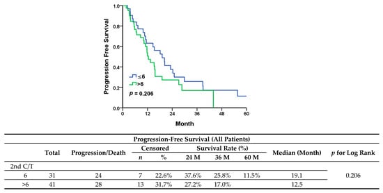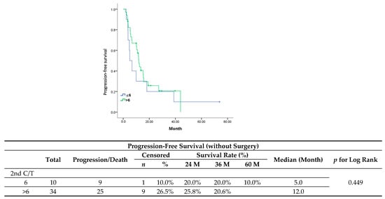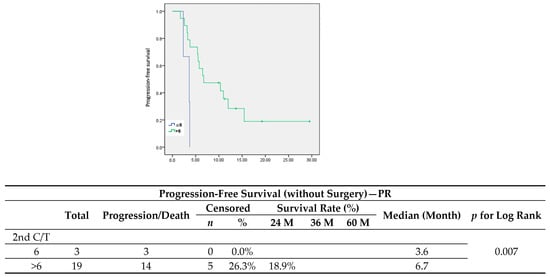 To better understand the role of maintenance chemotherapy, we focused on the patients who had not undergone surgery or radiotherapy and divided them more specifically into complete response and partial response groups after six cycles of second-line chemotherapy. In patients with partial response, maintenance chemotherapy led to a significant improvement in PFS (Figure 6) (median, 3.6 vs. 6.7 months, p = 0.007), but showed no significance in OS (Figure 7). The median cycle number of maintenance chemotherapy was 4 (range from 1–16).