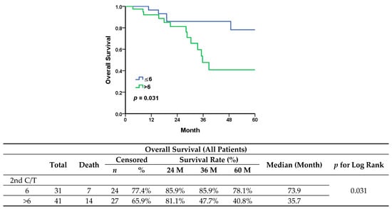 After the first recurrence, 26 (36.1%) patients underwent secondary cytoreductive surgery, with complete gross resection (R0) achieved in all of them. Two patients who had received radiotherapy were identified with localized recurrence but could not be resected completely, one of whom was diagnosed with brain metastases and the other with paraaortic lymphadenopathy, before the initiation of second-line chemotherapy. There were 44 patients (44/72, 61.1%) who underwent second-line salvage chemotherapy only. After primary management for first recurrence, the maintenance group showed worse outcomes in progression-free survival (Figure 2) (median, 12.5 vs. 19.1 months; p = 0.206) and significantly shorter overall survival (Figure 3) (median, 35.7 vs. 73.9 months; p = 0.031).