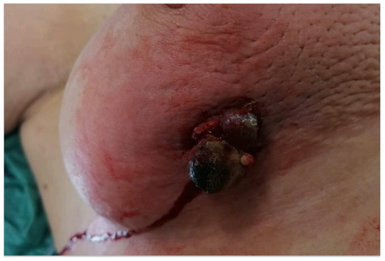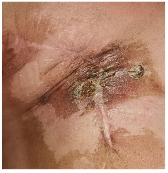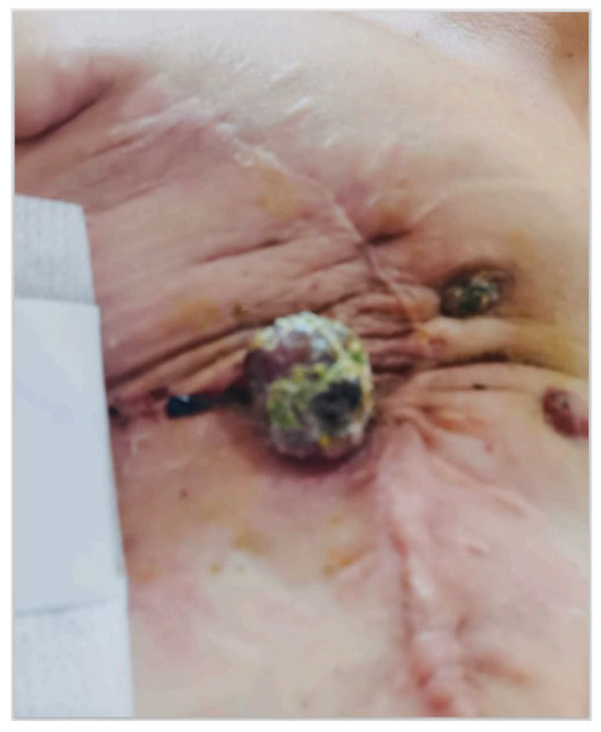 Five years later, the patient noticed an exophytic lump in the skin corresponding to the lower lateral quadrant of the right breast (Figure 1). Initially dismissed as a pimple, she became concerned when it increased in size over six months. A dermatological examination revealed a 20 mm lesion without pain, but with erythema and an orange peel skin appearance. During the medical visit, the lesion began to bleed, raising suspicion of a breast SBA (Figure 1). The patient was referred to our General Surgery Unit at Campania University “Vanvitelli” in Naples, Italy.