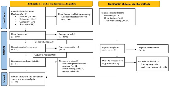Our systematic search resulted in 3952 records; after duplicate removal, we reviewed 2707 duplicate-free records. A total of 13 eligible studies were identified after title, abstract, and full-text selection [25,28,29,30,31,32,33,34,35,36,37,38,39]. A summary of the selection process is shown in Figure 1.