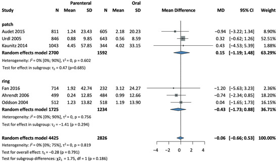 Six studies [28,30,32,35,37,38], covering a total of 7251 patients, were selected for analysis. No difference in contraceptive efficacy was found between the parenteral and the oral administration groups (MD = −0.06, CI: −0.66–0.53; I2 = 0%). In a subgroup analysis according to the method of administration, three studies [28,32,37], with 2959 patients in the patch group, (MD = 0.15, CI: −1.19–1.48; I2 = 0%) and three studies [30,35,38], with 4292 patients in the ring group (MD = −0.43, CI: −1.73–0.88; I2 = 0%) found similar results (see Figure 2). No statistically significant difference was detected (χ2 = 1.75, df = 1, p = 0.186) between the transdermal patch and the vaginal ring subgroups (see Figure 2).