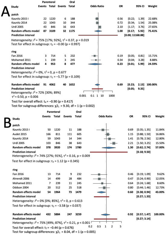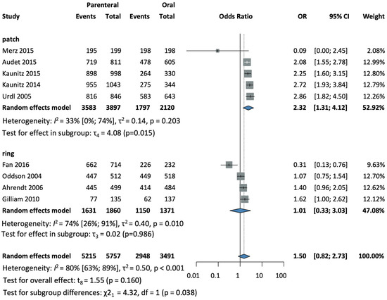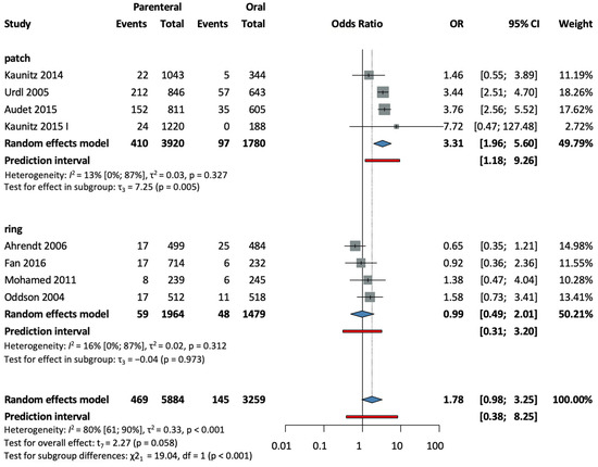 In a subgroup analysis according to the method of administration, four studies [28,32,33,37], with a total of 5700 patients in the patch subgroup (OR = 1.24, CI: 0.74–2.09; I2 = 16%), and two studies [30,35], with a total of 1976 patients in the ring subgroup (OR = 0.8, CI: 0.0–3828; I2 = 88%), found no significant difference compared to oral group (see Figure 7).