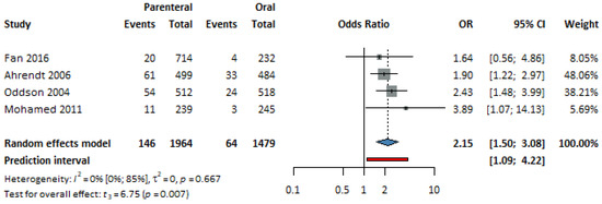 Four studies [30,35,38,39], with a total of 3443 patients, were selected for analysis. The parenteral group had increased odds of vaginal discharge, and this was statistically significant (p = 0,007, OR = 2.15, CI: 1.5–3.08; I2 = 0%) (see Figure 6).