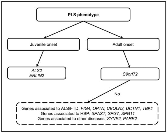Diagram showing the possible genetic work-up in PLS (only genes for which pathogenic variants have been reported are mentioned).