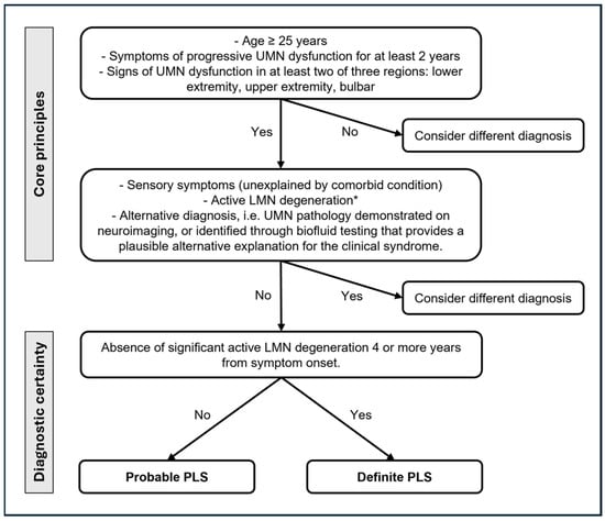 In 1945, the PLS diagnostic criteria [74] suggested a minimum of a five-year symptom duration for diagnosing PLS, while, in 1992, the Pringle criteria [17] proposed that a minimum symptom duration of three years would have permitted a reliable diagnosis, still describing as core features an adult onset of insidious spastic paresis in the lower limbs (but also in the bulbar or upper extremities), usually symmetric and in the absence of a family history. In 2006, the Gordon criteria [75] recommended a symptom duration of four years to label the diagnosis. Finally, the recent 2020 consensus diagnostic criteria (Figure 2) [7], recognizing the implications of diagnostic delay, introduced a category of “probable PLS” for patients with isolated UMN symptoms in at least two of three regions (lower extremity, upper extremity, and bulbar) for 2–4 years. The recognition of a pragmatic category of “probable PLS” reflects the desire to facilitate the earlier inclusion of patients with PLS in future trials of potentially disease-modifying therapy before the disability becomes advanced.