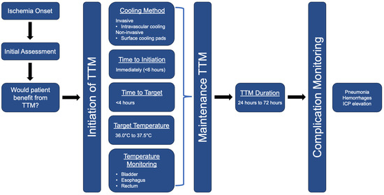 The limited available data suggest that adhering to the best practices of target temperature setting, timely initiation and induction, appropriate duration, method of cooling, and accurate temperature monitoring can improve outcomes among stroke patients (Figure 2). While there is no consensus for the optimal target temperature for TTM, maintaining a patient’s core temperature between 36.0 °C and 37.5 °C should be considered [50]. Lowering the body temperature within this range has been shown to reduce metabolic demand and neuronal excitotoxicity, thus protecting the brain from further injury [73]. However, individual patient factors, such as the severity of the stroke and pre-existing conditions, must be taken into account when determining the specific target temperature. Research suggests that the sooner TTM is initiated following a stroke, the better the outcomes for the patient [59]. Ideally, cooling should commence within the first 3–6 h post-stroke as delays may diminish the neuroprotective effects of TTM. Reaching the target temperature with a rapid induction phase, preferably within 4 h, is recommended for maximum efficacy [74]. The rate of cooling should be monitored closely to prevent complications associated with too rapid a decrease in body temperature. The duration of TTM varies based on the stroke’s severity and type but typically ranges from 24 to 72 h. Longer durations may be considered for severe cases, although this can increase the risk of complications like infections and coagulopathies [74]. Various methods are available for inducing hypothermia, including invasive techniques like intravascular cooling and non-invasive methods such as surface cooling pads. While invasive methods offer more precise temperature control, they carry a higher risk of complications. Non-invasive methods are less risky but might not provide the same level of temperature regulation [75]. Common sites for accurate temperature monitoring include the bladder, esophagus, and rectum. The esophageal site is often preferred due to its proximity to the heart and lungs, providing a more accurate reflection of core temperature [76]. Since there are no consensus guidelines for TTM in stroke patients, the continuous research and refinement of TTM protocols are necessary for fully harnessing its benefits.