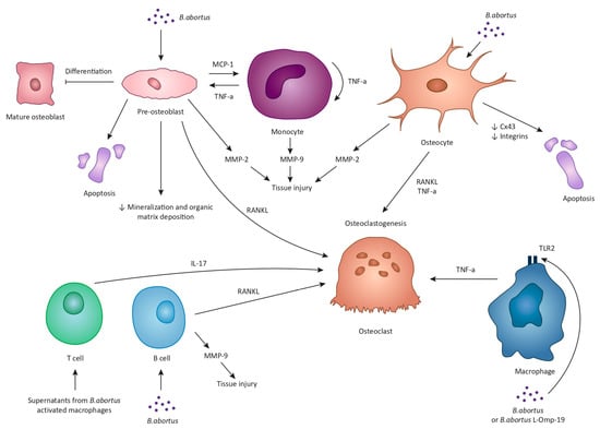 The underlying mechanisms of Brucella-induced osteoarticular disease are multiple, complex, and largely rely on experimental data from B. abortus studies. B. abortus can infect and replicate within osteoblasts and interfere with the physiological functions of these cells via three mechanisms: the induction of osteoblast apoptosis and the hampering of their differentiation; the inhibition of mineralization and organic matrix deposition; and the upregulation of receptor activator of nuclear factor kappa-B ligand (RANKL). Brucella-infected osteoblasts also secrete monocyte chemotactic protein 1 (MCP-1) that attracts monocytes and macrophages to the site of infection. In turn, these cells secrete tumor necrosis factor alpha (TNF-a) that, similarly, results in osteoblast apoptosis, decreased bone mineralization, and upregulation of RANKL. Brucella-infected osteoblasts and monocytes can also secrete matrix metalloproteinases, MMP-2 and MMP-9, respectively. Specifically, MMP-9 production is the result of the autocrine function of TNF-a produced by monocytes. Additionally, Brucella can multiply within osteocytes and lead to the production of MMP-2, RANKL, TNF-a, and proinflammatory cytokines. Moreover, Brucella and supernatants from Brucella-infected macrophages inhibit the expression of connexin 43 along with the expression of integrins, ultimately leading to osteocyte apoptotic cell death. Upon Brucella infection or in response to B. abortus, lipidated outer membrane protein 19 macrophages release inflammatory mediators such as TNF-a, eventually enhancing osteoclastogenesis. Moreover, supernatants from B. abortus-activated macrophages stimulate T cells to produce interleukin-17 which promotes osteoclast differentiation through the induction of proinflammatory cytokines. Finally, B. abortus-infected B cells produce MMP-9 and RANKL.