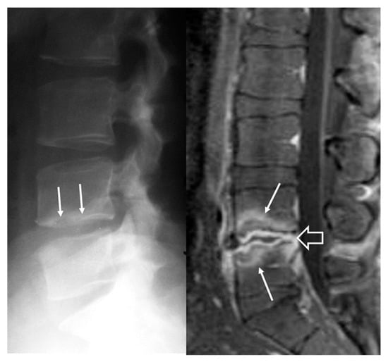 A 34-year-old man with Brucella spondylodiscitis. The initial lateral radiograph (left) shows a cortical disruption at the inferior epiphyseal plate of L4 vertebral body (arrows). The sagittal fat suppressed contrast enhanced T1-w MR image (right) shows septic discitis (open arrow) and bone barrow edema on both L4 and L5 vertebral bodies (arrows), suggesting spondylitis.