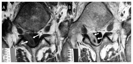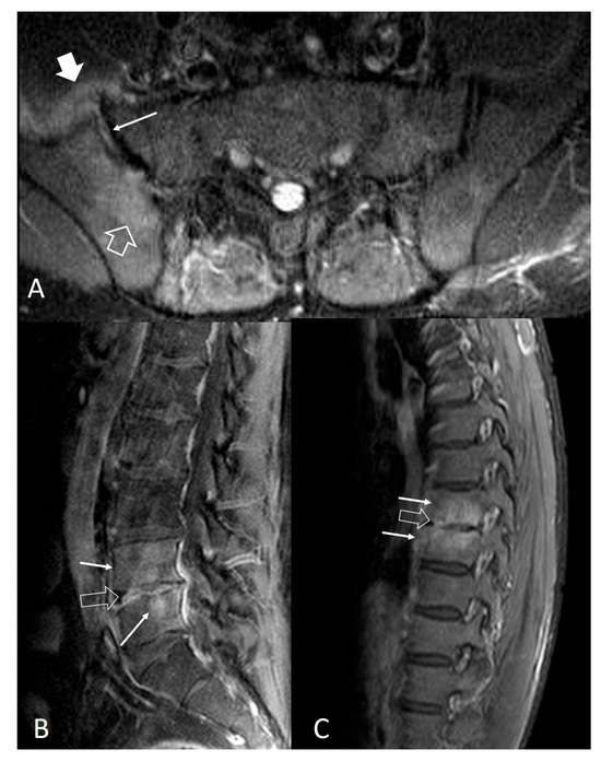 Magnetic resonance imaging (MRI) findings are not specific and follow the typical infection pattern, including a hypointense signal on T1-w images, hyperintensity on T2-w and STIR images, and enhancement of the disc and bone marrow edema foci (Figure 2, Figure 3 and Figure 4) [14,30]. The presence of intracanalicular abscess formation is confirmed with wall enhancement and is an indication for surgical decompression (Figure 3). Similarly, paravertebral abscesses are observed in approximately 30% of cases and are typically demonstrated with wall enhancement [30].