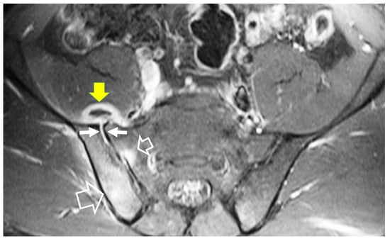 A 23-year-old male with a serologically proven diagnosis of brucellosis 9 months prior to current imaging. The patient received treatment for 3 months and now presents with recurrent symptoms. Axial fat-suppressed T1-w MR image showing enhancing bone marrow edema on both sides of the sacroiliac joints (open arrows), joint effusion (arrows), and anterior capsular thickening and enhancement (yellow arrow) in keeping with septic sacroiliitis.