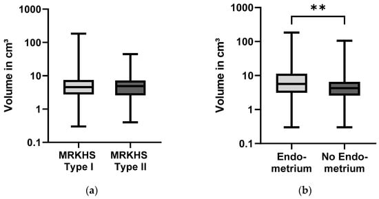 - Preibsch, H.; Rall, K.; Wietek, B.M.; Brucker, S.Y.; Staebler, A.; Claussen, C.D.; Siegmann-Luz, K.C. Clinical value of magnetic resonance imaging in patients with Mayer-Rokitansky-Küster-Hauser (MRKH) syndrome: Diagnosis of associated malformations, uterine rudiments and intrauterine endometrium. Eur. Radiol. 2014, 24, 1621–1627. [Google Scholar] [CrossRef] [PubMed]