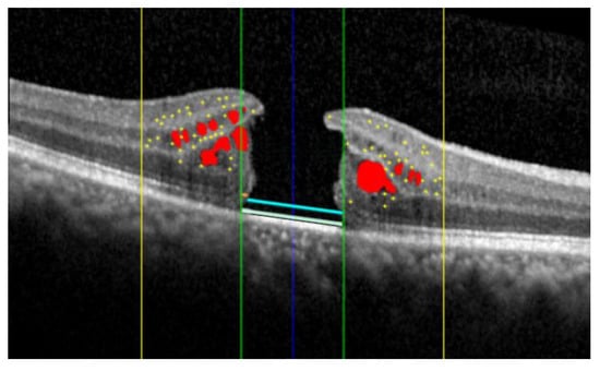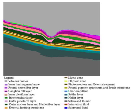 In recent years, telemedicine and artificial intelligence (AI), especially deep learning (DL)-based systems, have made significant progress, offering promising opportunities for developing efficient tools to quantify key parameters in macular disorders [,,]. Different AI-based algorithms show high performance in detecting retinal fluid [,] and assessing anatomical changes throughout disease progression []. Furthermore, AI has demonstrated its capability, particularly in eyes with age-related macular degeneration (AMD), to detect the presence of intraretinal fluid (IRF) and subretinal fluid (SRF) and to provide quantitative data in real-world scenarios [].