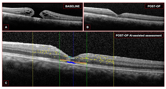 Best-Corrected Visual Acuity (BCVA), measured as the Logarithm of the Minimum Angle of Resolution (LogMAR), was recorded at baseline and 6 months after surgery for every patient, together with a Spectral Domain Optical Coherence Tomography (SD-OCT) exam in the same timelapse. All the SD-OCT scan images were obtained using the Spectralis HRA + OCT2 platform (Heidelberg Engineering, Heidelberg, Germany). For each eye studied, a volume scan of 20 × 20° (approximately 6 × 6 mm) with 49 horizontal B-scans (with an automated real-time value set at 25 frames per scan) and a high-resolution horizontal B-scan (30° in length with an automated real-time value set at 100 frames) were analyzed by the AI algorithm at baseline and 6 months postoperatively. The minimum hole width was measured at the narrowest point of the hole in the mid-retina using the inbuilt caliper function. The measurements were performed on high-resolution horizontal scans passing through the center of the foveal depression, as a line drawn roughly parallel to the Retinal Pigment Epithelium (RPE) [,].