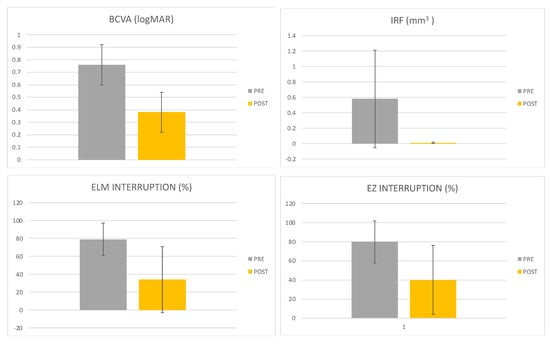 Histograms representing BCVA, IRF, and ELM and EZ interruption values in preoperative and postoperative phases.