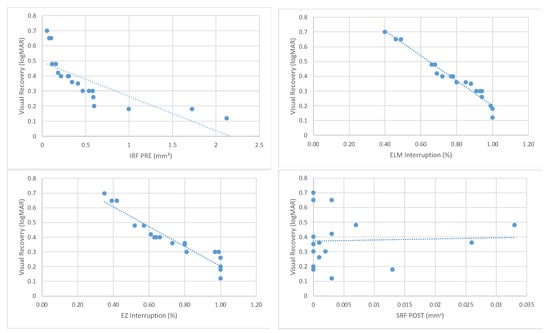 Both the preoperative percentage of ELM interruption and the percentage of EZ interruption exhibited negative correlations (R = −0.50 and R = −0.53, respectively) with the recovery of BCVA after surgery. These correlations were statistically significant (p = 0.026 and p = 0.017, respectively).