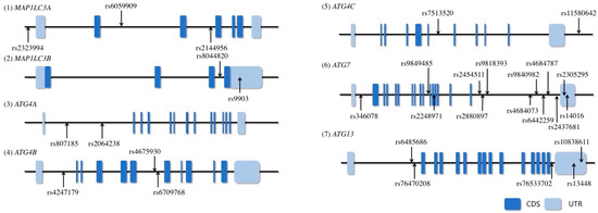 As mentioned in the introduction, we defined MAP1LC3A, MAP1LC3B, ATG4A, ATG4B, ATG4C, ATG7, and ATG13 as candidate genes. We extracted tag SNPs from the candidate genes as follows. First, all the SNPs within the candidate gene and 3 kb upstream from the promoters, reported by the 1000 Genome Project database (GRCh37 p.13) in Japanese individuals, were selected. Second, we excluded the SNPs with minor allele frequencies < 0.1. Subsequently, we selected SNPs that met r2 > 0.8 (pair-wise tagging method) as tag SNPs using the Haploview 4.2 software. Figure 2 shows the locations of the tag SNPs in the candidate genes.