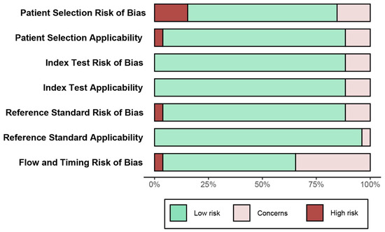 - Whiting, P.F.; Rutjes, A.W.; Westwood, M.E.; Mallett, S.; Deeks, J.J.; Reitsma, J.B.; Leeflang, M.M.; Sterne, J.A.; Bossuyt, P.M.; Group, Q. QUADAS-2: A revised tool for the quality assessment of diagnostic accuracy studies. Ann. Intern. Med. 2011, 155, 529–536. [Google Scholar] [CrossRef] [PubMed]