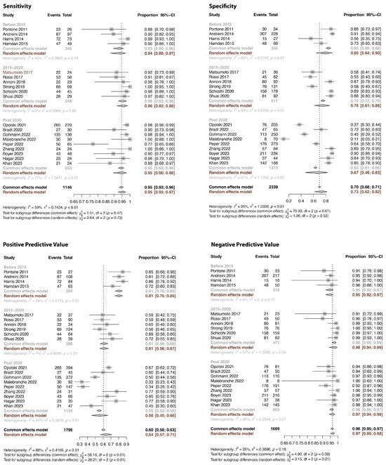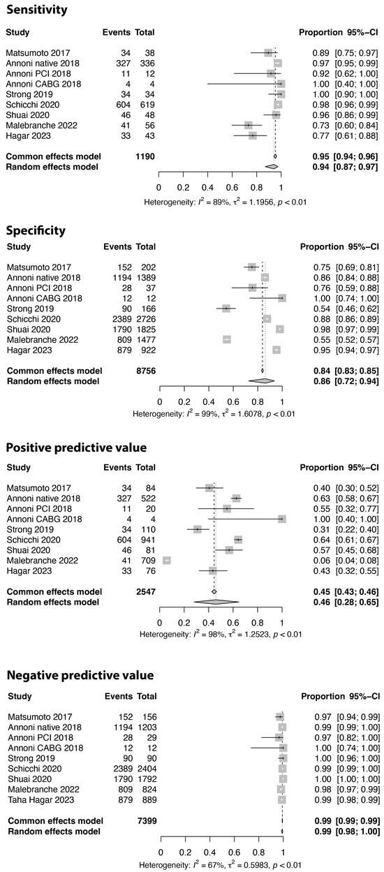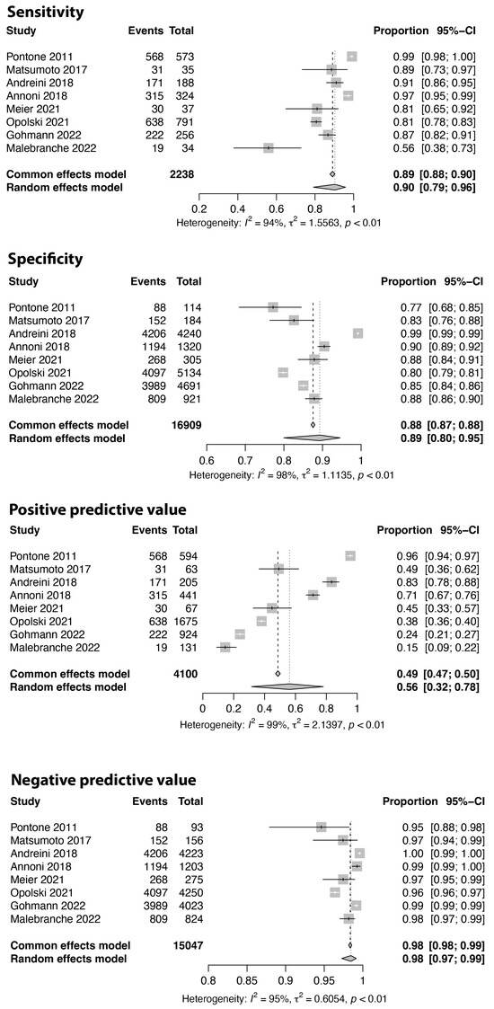 - Schlattmann, P. Tutorial: Statistical methods for the meta-analysis of diagnostic test accuracy studies. Clin. Chem. Lab Med. 2023, 61, 777–794. [Google Scholar] [CrossRef]