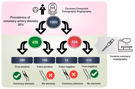 - Schlattmann, P.; Schuetz, G.M.; Dewey, M. Influence of coronary artery disease prevalence on predictive values of coronary CT angiography: A meta-regression analysis. Eur. Radiol. 2011, 21, 1904–1913. [Google Scholar] [CrossRef] [PubMed]