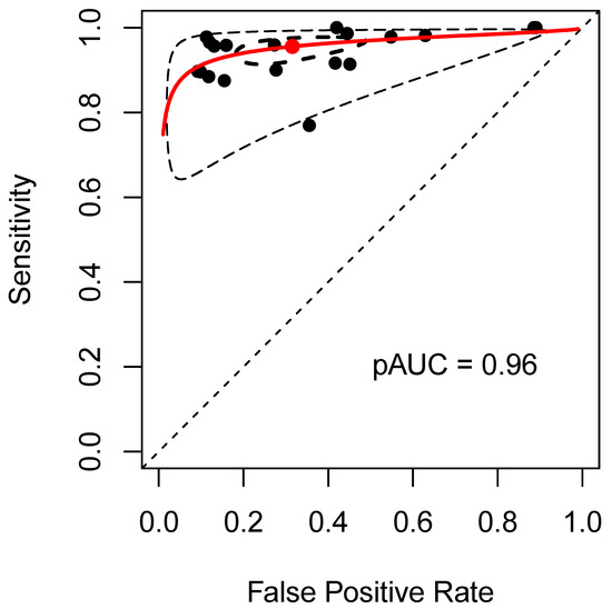 - Patel, A.; Cooper, N.; Freeman, S.; Sutton, A. Graphical enhancements to summary receiver operating characteristic plots to facilitate the analysis and reporting of meta-analysis of diagnostic test accuracy data. Res. Synth. Methods 2021, 12, 34–44. [Google Scholar] [CrossRef]