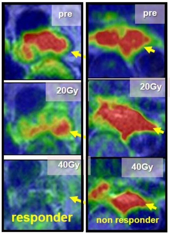 | Ott et al. [45] | 2006 | FDG-PET | 65 | AC | ◿SUV (>35%: 2 W after beginning of CRT) |