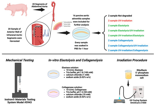 Twenty aortic segments selected from the abdominal region were used in this study. They were stored in a freezer (−80 °C) and thawed when needed. The adventitial specimens were prepared as previously reported [11], by removing the extraneous fat and connective tissue from the external surface of the vessel, initiating a dissection at a corner with a surgical scalpel, and carefully peeling off the adventitia by hand. Eight sets of 2 adventitial specimens (5 × 3 cm each) were soaked in phosphate-buffered saline (PBS) for 1 h, and each was placed in a Petri dish (6-cm diameter). Thus, in the end, only 16 porcine aortic adventitia samples were analyzed and included in this study. One set of 2 specimens was employed as an untreated control from the previously mentioned samples, and another set was irradiated only. The remaining samples were divided into 6 sets of 2 specimens each: 3 sets for the collagenolysis protocol and 3 sets for the elastolysis protocol (Figure 1). We aimed at studying adventitial tissue that was significantly depleted of either elastin or collagen. As previously shown [12,13], the first could be obtained by short-term elastolysis, and the second by long-term collagenolysis.