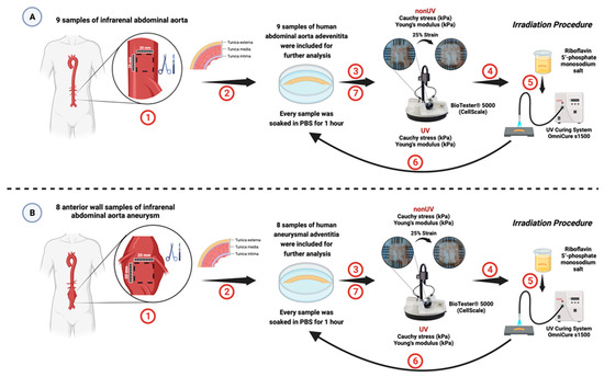 Graphical representation of the experimental study design that was conducted on human aortic adventitia samples. The study stages were similar for samples taken from the normal infrarenal aorta (A) at autopsy and those taken intraoperatively from patients with AAA (B). The specimens were harvested first (1), from which the adventitia was later prepared and separated (2). After that, the samples were rested in PBS for one hour at room temperature before analyzing the biomechanical profile at 25% strain (3). Further, the samples were then soaked in RF for 30 min (4) and irradiated externally with an intensity of 45 mW/cm2 for 10 min (5). Following irradiation, the samples were rested in PBS for one hour (6) and then reanalyzed for their biomechanical profile using the same protocol used previously (7). Created with BioRender.com.