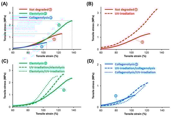Stress–strain plots of aortic adventitial tissue under uniaxial loading. (A). Plots of enzymatically degraded (elastase, collagenase) and non-degraded tissue specimens. (B). Plots of non-degraded tissue before and after irradiation. (C). Plots of tissue exposed to elastase (10 U/mL, 1 h), irradiated before and after digestion. (D). Plots of tissue exposed to collagenase (10 U/mL, 20 h), irradiated before and after digestion. Irradiation was performed with UV-A rays (wavelength 365 nm), at an irradiance of 45 mW/cm2, for a duration of 10 min (resulting in a fluence of 27 J/cm2).