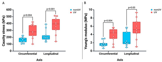 Plots of Cauchy stress (A) and Young’s modulus (B) at 1.25 stretch ratio in the longitudinal and circumferential directions for the 9 human abdominal aortic adventitia samples suggesting an increase in strength and stiffness post-UVA irradiation for both axes.