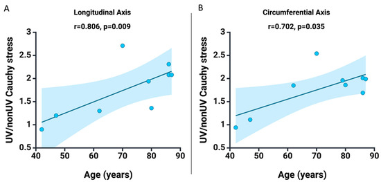 Spearman correlation between age and the benefit of exposure to UV-A radiation specific to Cauchy stress for (A) the longitudinal axis and (B) the circumferential axis. Additionally, the graphs display the fitted line, which is a linear function that describes the data set, and the shaded area indicates the 95% confidence interval.