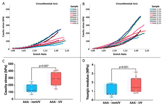 Graphic representation of circumferential axis of (A): Cauchy stress versus stretch behavior of all human abdominal aortic aneurysmal adventitia samples, non-UV, (B): Cauchy stress versus stretch behavior of all human abdominal aortic aneurysmal adventitia samples following exposure to UV-A irradiation, and (C,D): the biomechanical profile of samples before and after treatment.