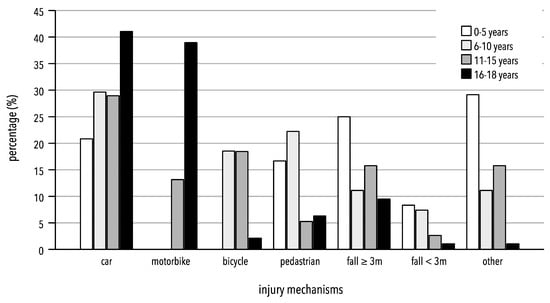 Furthermore, accidents in road traffic were primarily responsible for polytrauma in children and adolescents in our cohort. Similar results were observed when comparing with the international literature. According to these studies, approximately 24–41% of polytraumas in children and adolescents were caused by collisions with vehicles [19,20]. Debus et al. described that the mechanisms of accidents in road traffic varied with age, ranging from pedestrian accidents to bicycle or motorcycle accidents and car accidents, reflecting age-appropriate roles in road traffic, as they implicate that trauma mechanisms change with the range of action of children [1]. This is also reflected in the results of our study. When comparing the different age groups, it becomes apparent that in children under 5 years of age, various other injury patterns as well as falls from great heights were the leading causes of trauma.