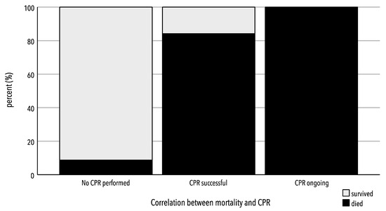 Patients who were successfully resuscitated before arriving at the hospital and patients who were admitted under resuscitation showed significantly higher mortality rates compared to the group of non-resuscitated patients (no resuscitation: 8.8% (n = 14); vs. short/successful resuscitation: 84.2% (n = 16)). No significant difference was observed in the mortality rate between patients with successful resuscitation and those with ongoing resuscitation.
