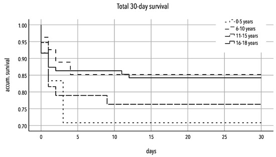 Kaplan–Meier curve of 30-day survival rate of severely injured patients (ISS ≥ 16) 0–5 years vs. 6–10 years vs. 11–15 years vs. 16–18 years.
